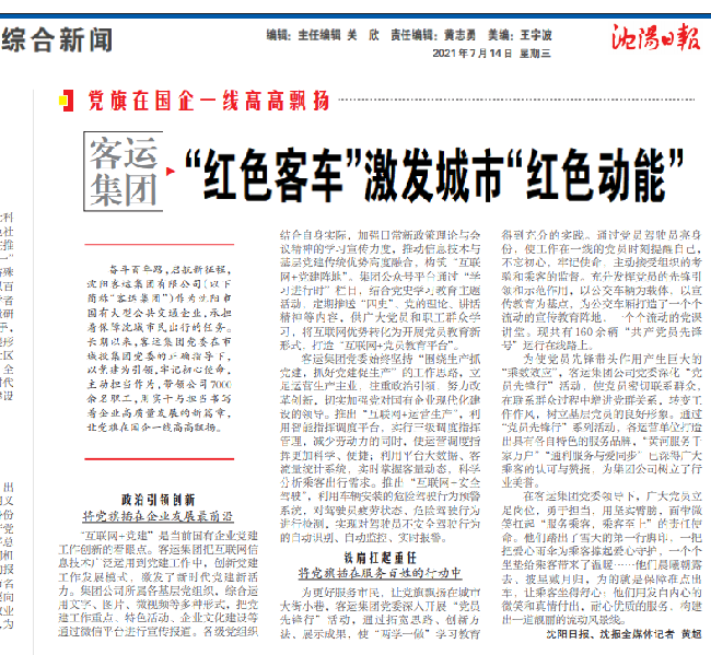 7月14日,沈陽日?qǐng)?bào)以《 “紅色客車”激發(fā)城市“紅色動(dòng)能”》為題報(bào)道了沈陽客運(yùn)集團(tuán)以黨建為引領(lǐng),助推企業(yè)高質(zhì)量發(fā)展之新變化。